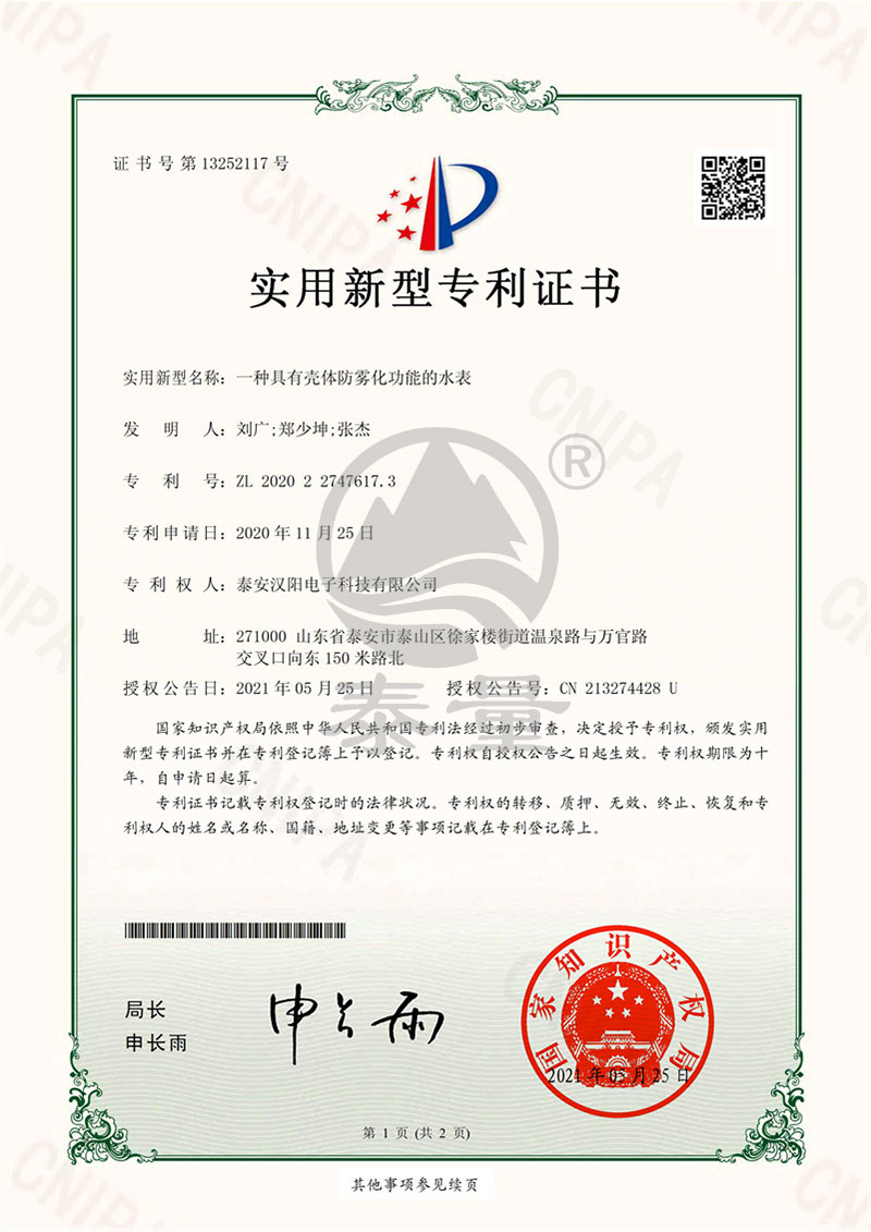 FZ20-522一種具有殼體防霧化功能的水表-證書